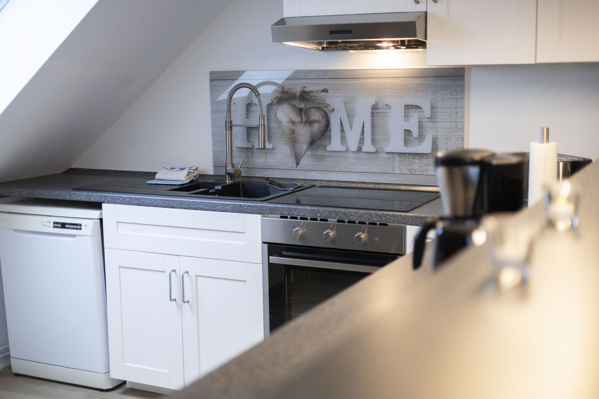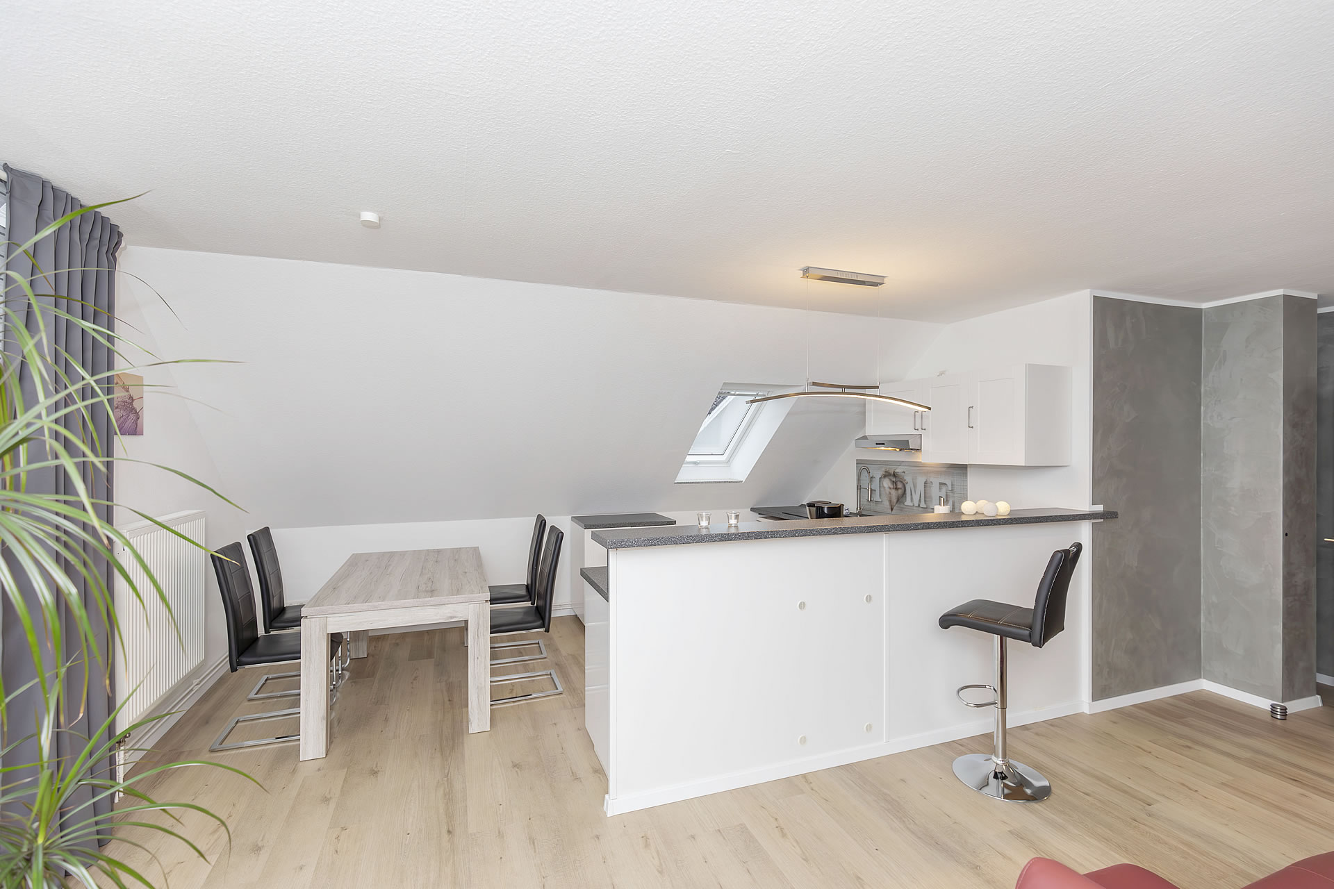 Der Küchenbereich ist komplett eingerichtet mit einem großen Esstisch (160 cm ),