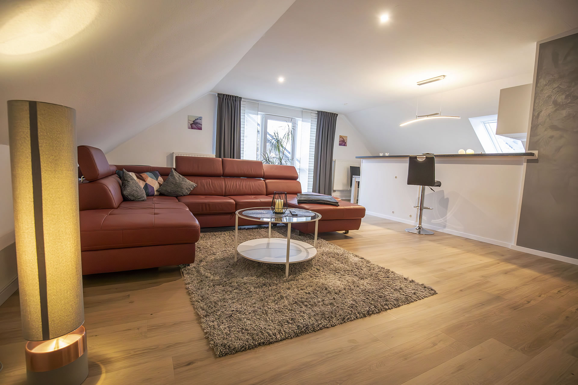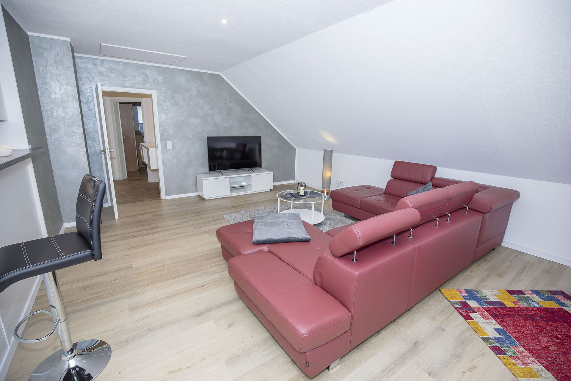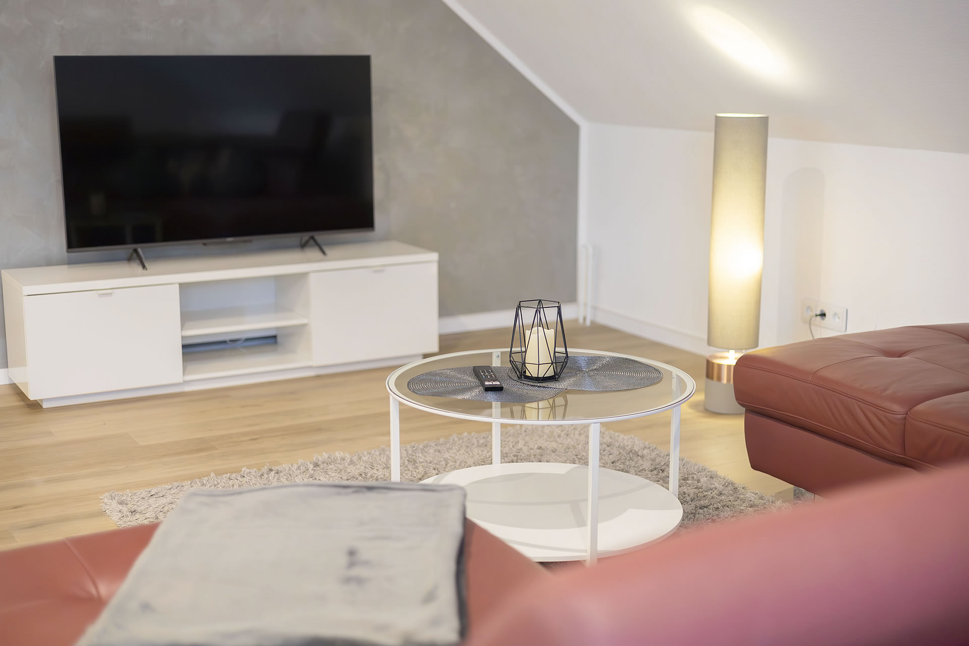 Gemütliche Wohnlandschaft mit Beistelltisch, großer LED Flachbildschirm (55 Zoll).