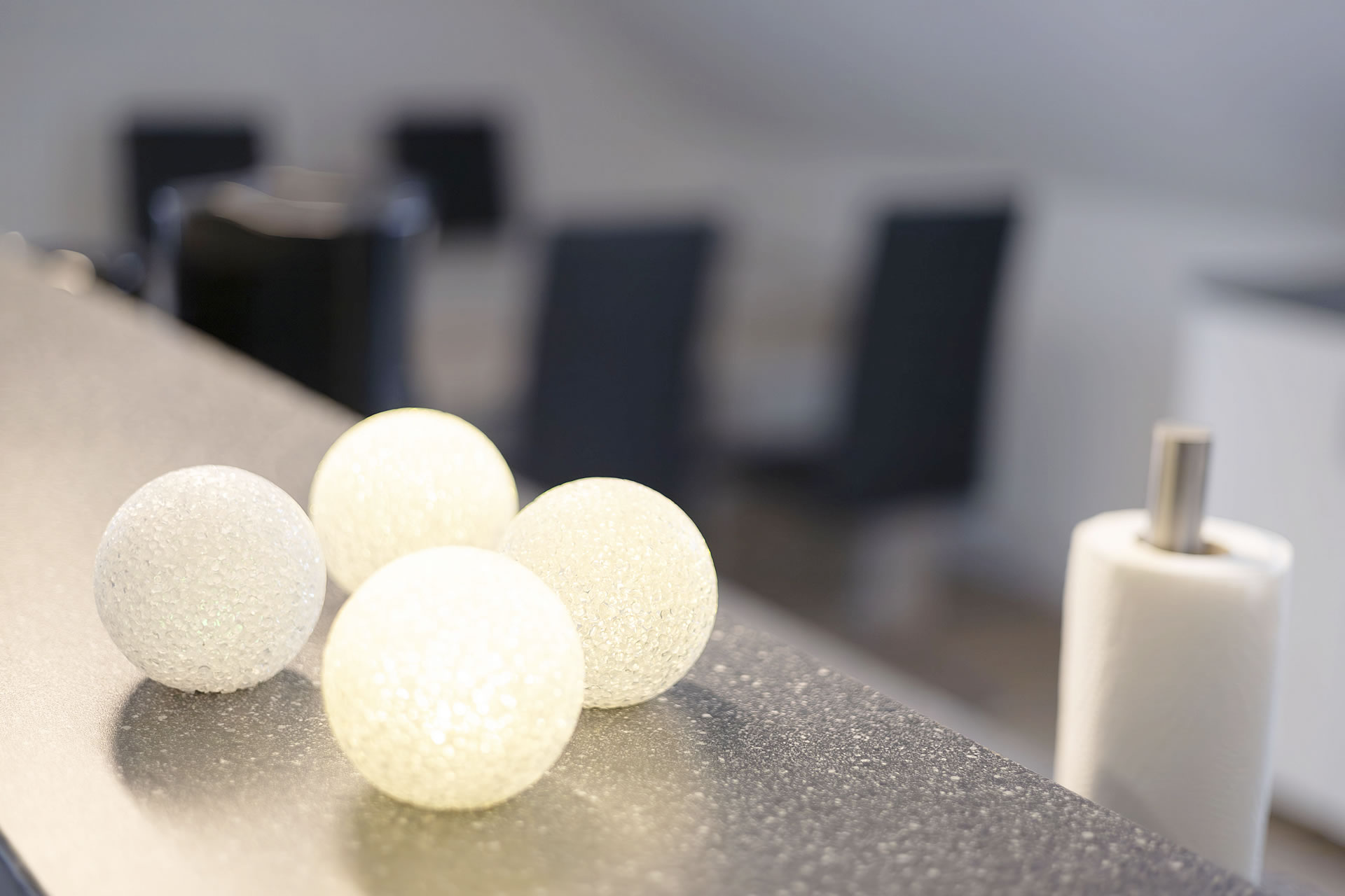 Der Küchenbereich ist komplett eingerichtet mit einem großen Esstisch (160 cm ),